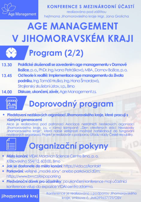- budou představeny praktické výstupy projektů zavádění age managementu v příspěvkových organizacích Jihomoravského kraje v sociální oblasti