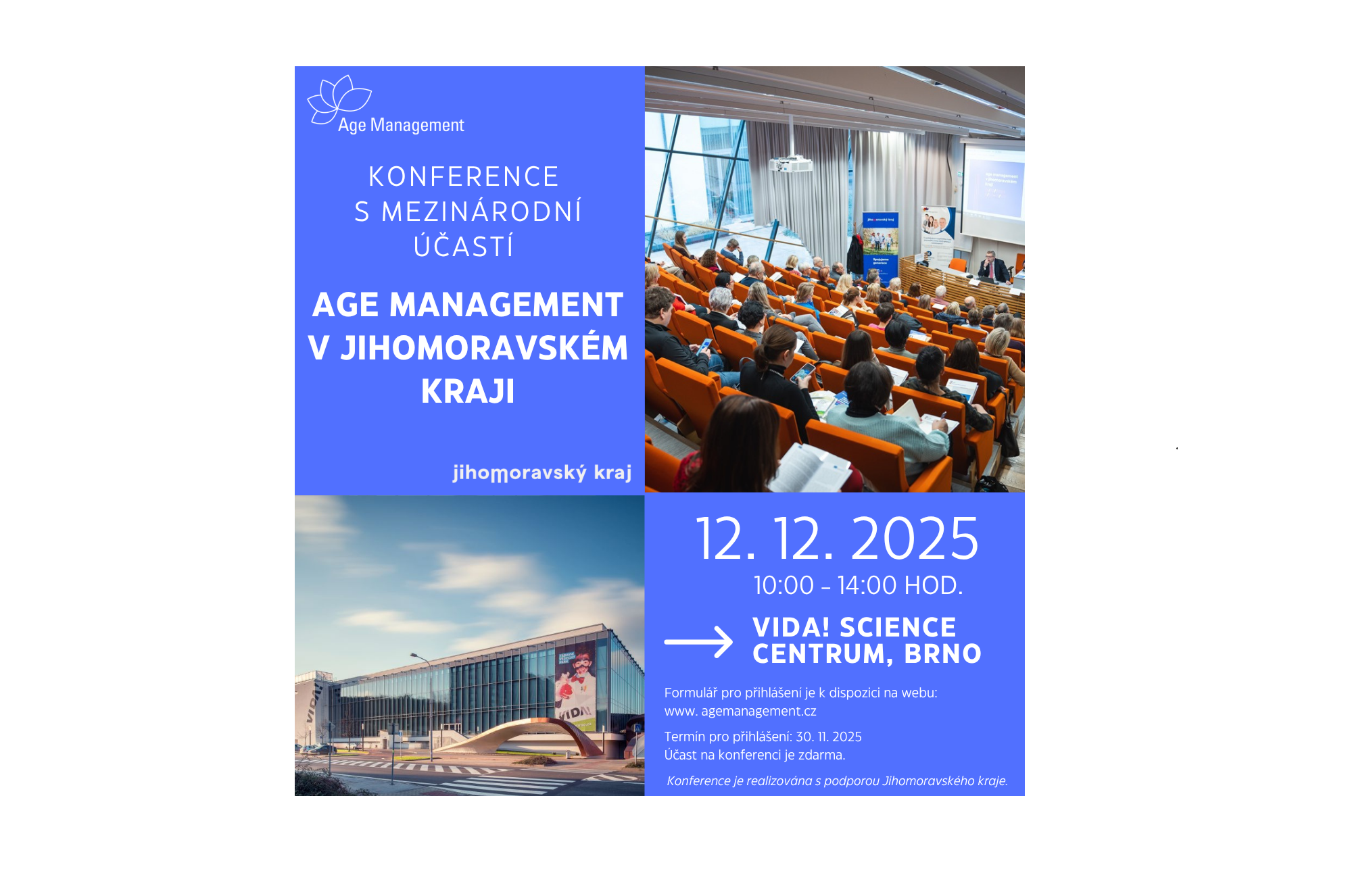 Dne 12. prosince 2025 se v VIDA! Science Centru v Brně uskuteční mezinárodní odborná konference Age management v Jihomoravském kraji, pořádaná Age Management z. s. za podpory Jihomoravského kraje a pod záštitou hejtmana Mgr. Jana Grolicha.